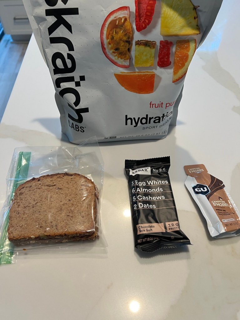Then there is the ‘real’ food in this case an almond butter and jelly sandwich. A longtime staple of mine as with the thin-sliced multigrain bread and lite spread of both the almond butter and jelly it can even be eaten while riding. Although small bites are required.