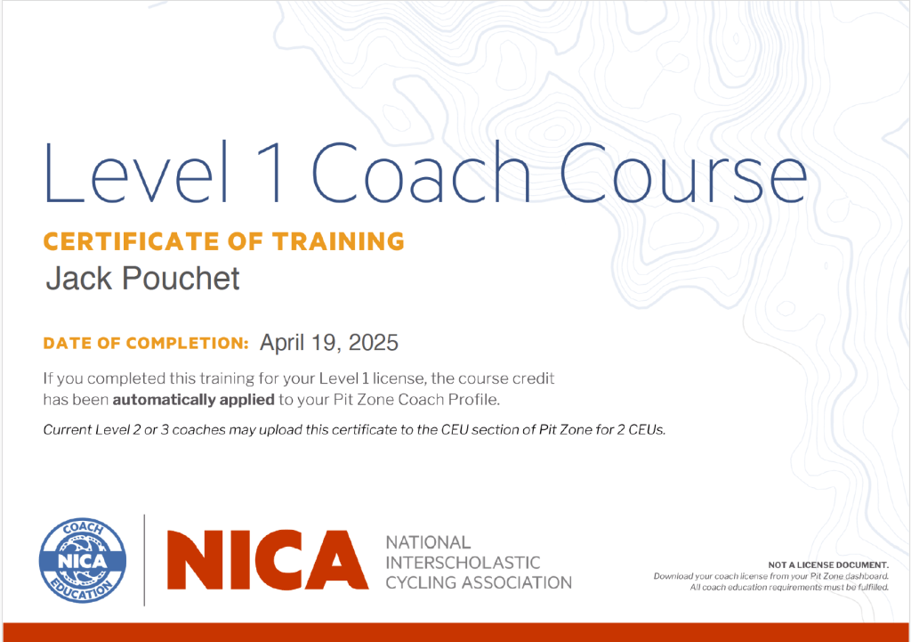 Yay, very happy to report that I completed all of my in-field, extra-credit, and online training to become a NICA Level 1 Coach. Perfect timing as we start recruiting for the new Trabuco Hills Mountain Bike Team next week at the local (Irvine Lake) Over-the-Hump series. I am really looking forward to help getting more kids on bikes!