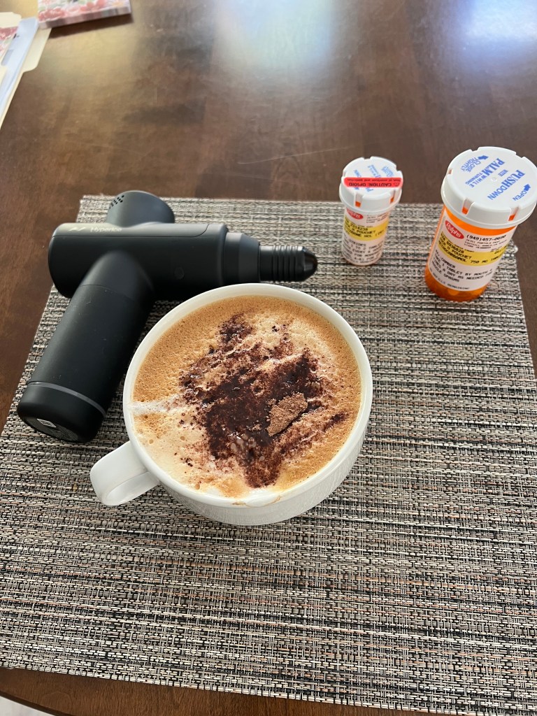 Getting through the day. Said bye-bye to the oxycodone and hello to the portable massage unit. Great temporary relief!